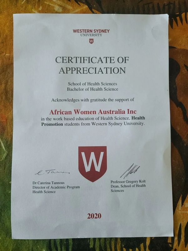 AWAU has been recognised by Western Sydney University for its experience in training students since 2020. AWAU is open to further partnerships to work with students looking to expand their knowledge on Afrocentric approaches to health and wellbeing for marginalised women